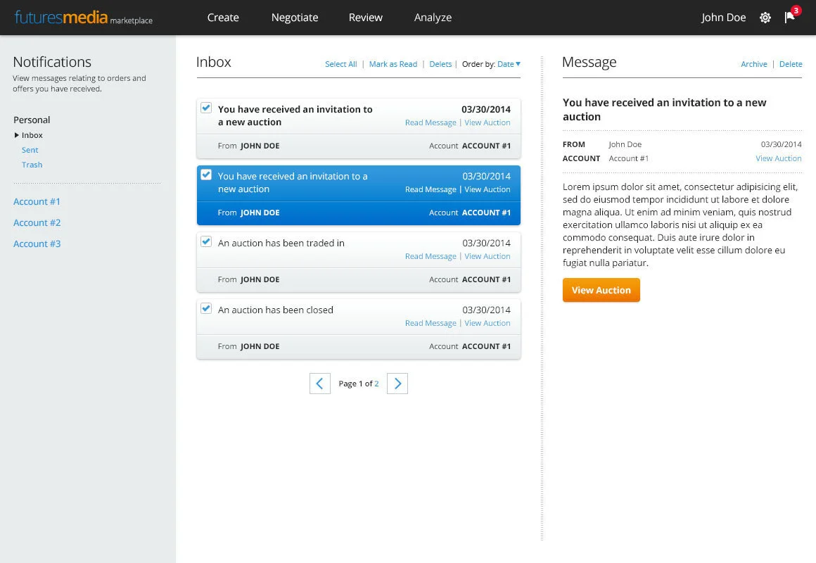 For this web-based media trading application, different user personas were created to define activity in the application – buyers who wanted to purchase media, sellers who had media to sell, and managers who needed to approve transactions. The application was designed to walk users through the process of buying or selling media, with a UI focused on data input and visualization for large amounts of financial and demographic information.